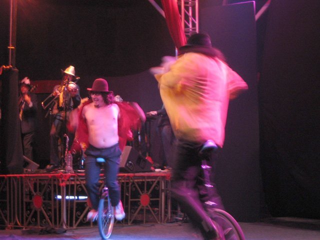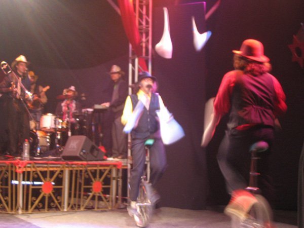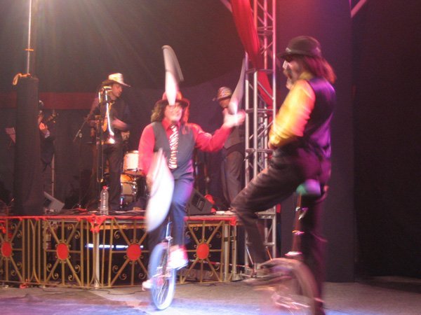 Los Hermanos Moreno montados sobre sus monociclos y pasándose mazas conseguirán divertir al público mientras se quitan la ropa.